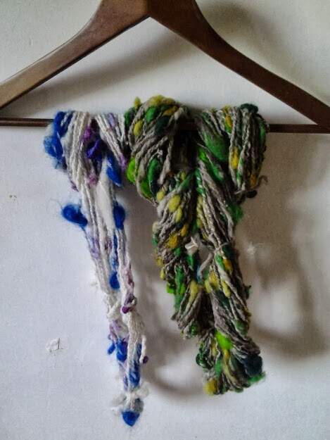 My skeins (wool that has been spun, plied and tied in a loose knot ) started very chunky and bumpy.It felt spinning was completely out of my control, the wool sped itself into the wheel in one great lump, gradually the coordination of controlling the pedal and feeding the wool came to me.